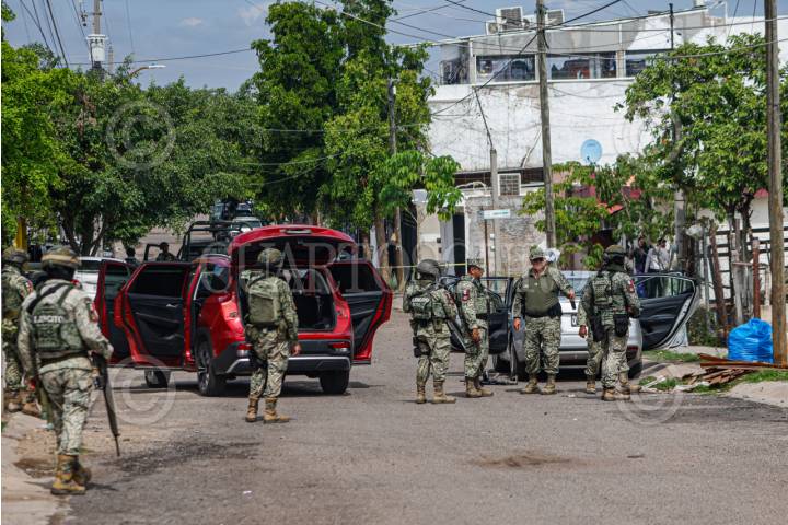 CULIACÁN, SINALOA, 05JULIO2025.– Elementos del Ejército Mexicano resguardan la zona del fraccionamiento Antonio Nakayama, sector Barrancos, tras un enfrentamiento armado que dejó daños en una vivienda y un vehículo estacionado. FOTO: JOSÉ BETANZOS ZÁRATE /CUARTOSCURO.COM