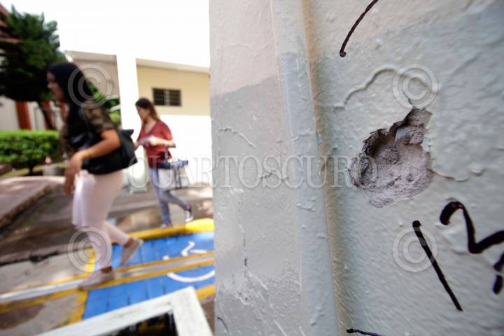 CULIACÁN, SINALOA.- Elementos del ejercito mexicano y personal de la Procuraduría del Estado, acudieron a la Facultad de Derecho de la Universidad Autónoma de Sinaloa donde resultó lesionado Jesús Carrasco Ruiz, comandante de la Policía Investigadora, quien se enfrento contra sujetos que intentaron dispararle. El hecho ocurrió alrededor de las 07:40 horas sobre el pasillo principal de la Facultad de Derecho, frente al auditorio Dr. Diego Valadés Ríos. El comandante Jesús Carrasco se dirigía hacia uno de los salones de clase en donde cursa la licenciatura en Derecho. Fotos: JUAN CARLOS CRUZ /CUARTOSCURO.COM