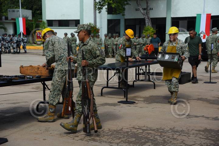 CUERNAVACA, MORELOS, 31JULIO2024.- Elementos de la Ejército Nacional participan en la "Ceremonia de destrucción de armamento decomisado a disposición del Ejército Mexicano". El evento se llevo a cabo en el cuartel general de la 24/a Zona Militar. Se destruyeron 135 armas largas, 67 armas cortas, 314 cargadores de diferentes armas y 15843 cartuchos de diversos calibres. Dos de estas armas fueron entregadas por la Fiscalía de Justicia y las 200 restantes por la Fiscalía General de la Republica. FOTO: MARGARITO PÉREZ RETANA/CUARTOSCURO.COM