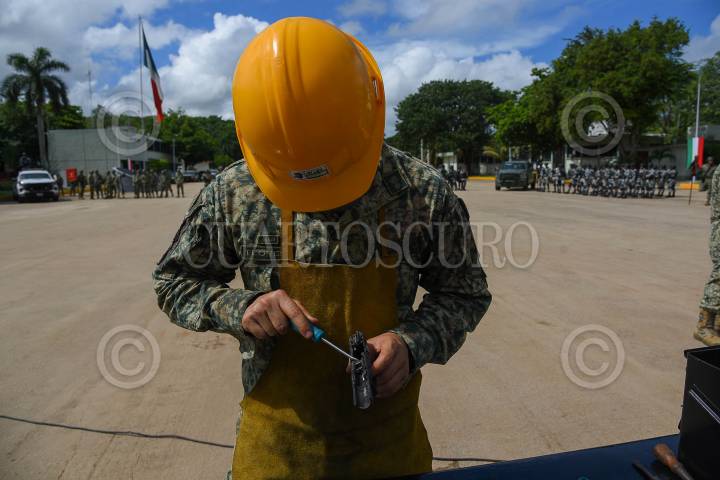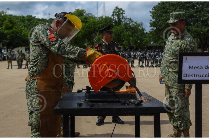 CUERNAVACA, MORELOS, 31JULIO2024.- Elementos de la Guardia Nacional participan en la "Ceremonia de destrucción de armamento decomisado a disposición del Ejército Mexicano". El evento se llevo a cabo en el cuartel general de la 24/a Zona Militar. Se destruyeron 135 armas largas, 67 armas cortas, 314 cargadores de diferentes armas y 15843 cartuchos de diversos calibres. Dos de estas armas fueron entregadas por la Fiscalía de Justicia y las 200 restantes por la Fiscalía General de la Republica. FOTO: MARGARITO PÉREZ RETANA/CUARTOSCURO.COM
