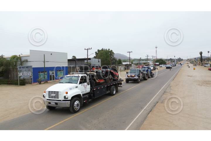 Una caravana de carros baleados son trasladados por carretera a Ensenada después de haber sido baleados en un ataque armado que dejó el salto de diez personas muertas y nueve heridas.