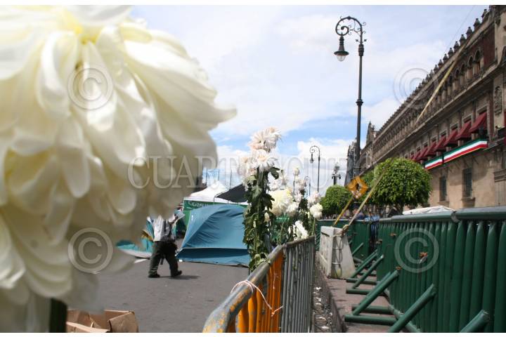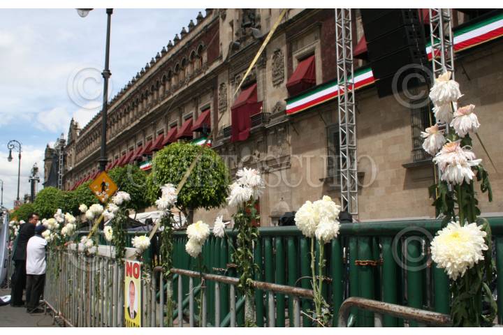 MÉXICO, D.F. 14SEPTIEMBRE2006.- Ante la celebración del grito de independencia, el ambiente en el Zócalo de la ciudad de México comienza a acelerarse. Frente a Palacio Nacional se han colocado unas ballas de seguridad donde se han colocado ramos de crizantemos blancos. FOTO: PAOLA HIDALGO/CUARTOSCURO.COM