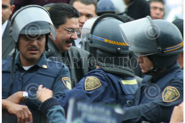 MÉXICO D.F., 12JUNIO2009.- Maestros de distintas entidades del país, en el Distrito Federal, marcharon esta tarde donde acudieron a diversas dependencias tales como el Senado de la República alas oficinas del ISSSTE, Televisa y Secretaria de Gobernación en donde derribaron las ballas que colocaron elementos de la policía Federal para resguardar el lugar sobre la calle Abraham Gonzalez. FOTO:LUIS CARBAYO/CUARTOSCURO.COM