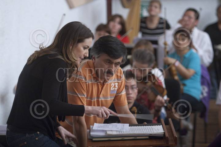 MÉXICO, D.F., 12JULIO2012.- La directora de orquesta Alondra de la Parra, ensaya con los músicos de la Milenium Sinfonietta que se preparan para la presentación de ballet de la Gala Jóvenes Talentos Mexicanos, el próximo 14 de julio en el Palacio de Bellas Artes. FOTO: FRANCISCO RODRIGUEZ CUARTOSCURO.COM