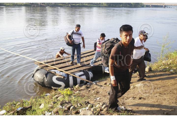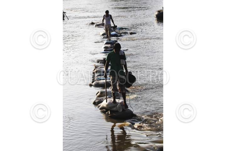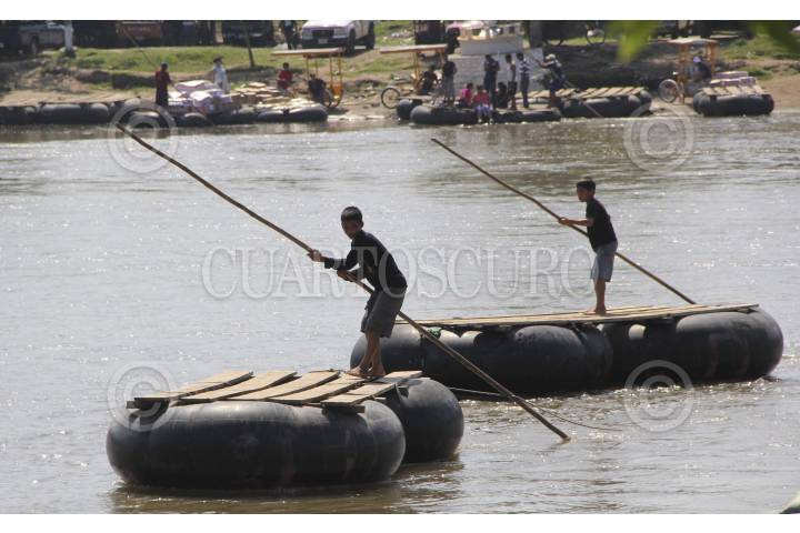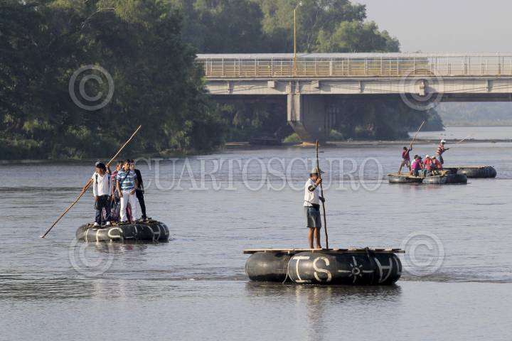 SUCHIATE, CHIAPAS., 05MAYO.- Leche, azúcar, gasolina, harina, ropa, migrantes, armas, droga… de todo y a todas horas, esta “mercancía” es transportada por la el río Suchiate, Chiapas, frontera natural entre México-Guatemala, a espaldas del puente fronterizo y sin dar vista a la estación aduanal. Desde temprano por la mañana, y hasta que se oculta el sol, cientos de balseros utilizan una plataforma de madera montada sobre cámaras de trailers, para transportar personas y mercancía de un lado a otro de la frontera. Este paso fronterizo natural –paralelo a la aduana formal que el gobierno de México instaló el puente llamado Tecun Uman, ha sido utilizado ancestralmente como zona de transporte y paso entre las dos naciones. FOTO: ELIZABETH RUIZ /CUARTOSCURO.COM
