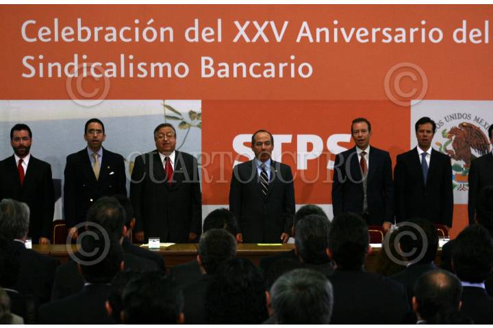 MEXICO, D.F., 28SEPTIEMBRE2007.-Enrique Aguilar Borrego, Enrique Castillo Sánchez, Presidente de la Asociación de Bancos de México., José Carlos Torres García Secretario General de la Federación Nacional de Sindicatos Bancarios la FENASIB, Secretario General del Sindicato de BANORTE. Luis Ángel Romo, Secretario General del Sindicato de BANOBRAS, presidente Felipe Calderon Hinojosa y el Secretario del Trabajo Javier Lozano Alarcon durante la celebracion del aniversario 25 del Sindicalismo Bancario en Mexico. FOTO:SASHENKA GUTIERREZ/CUARTOSCURO.COM