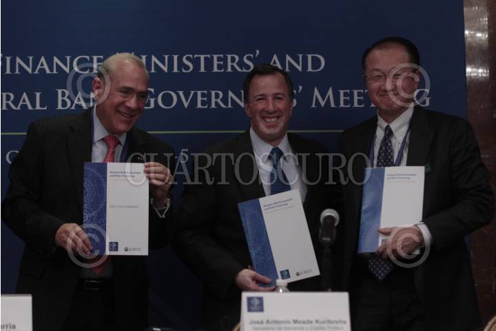 MÉXICO, D.F., 04NOVIEMBRE2012.-Jose Angel Gurria, Secretario General de la OCDE junto a Jose Antonio Meade Curibeña, Secretario de Hacienda y Credito Publico y Jim Yong Kim, Presidente del Banco Mundial durante la conferencia ante los medios de comunicación sobre el aumento de la fortaleza financiera a traves del manejo de desastres. FOTO: ENRIQUE ORDÓÑEZ /CUARTOSCURO.COM