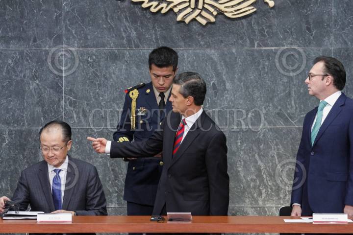 MÉXICO, D.F., 19NOVIEMBRE2014.- Jim Yong Kim, presidente del Banco Mundial, Enrique Peña Nieto, presidente de México, y Luis Videgaray, secretario de Hacienda, durante la firma del convenio mediante el cual, el Banco Mundial prestará a México 350 millones de dólares para apoyar el principal programa social federal "Prospera" FOTO: ISAAC ESQUIVEL /CUARTOSCURO.COM