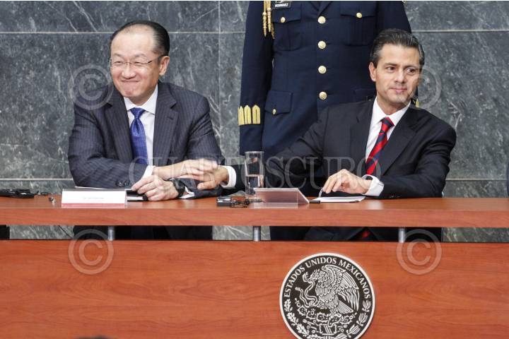 MÉXICO, D.F., 19NOVIEMBRE2014.- Jim Yong Kim, presidente del Banco Mundial, y Enrique Peña Nieto, presidente de México, durante la firma del convenio mediante el cual, el Banco Mundial prestará a México 350 millones de dólares para apoyar el principal programa social federal "Prospera" FOTO: ISAAC ESQUIVEL /CUARTOSCURO.COM