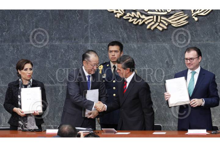 MÉXICO, D.F., 19NOVIEMBRE2014.- Rosario Robles, titular de la Sedesol, Jim Yong Kim, presidente del Banco Mundial, Enrique Peña Nieto, presidente de México, y Luis Videgaray, secretario de Hacienda, durante la firma del convenio mediante el cual, el Banco Mundial prestará a México 350 millones de dólares para apoyar el principal programa social federal "Prospera" FOTO: ISAAC ESQUIVEL /CUARTOSCURO.COM