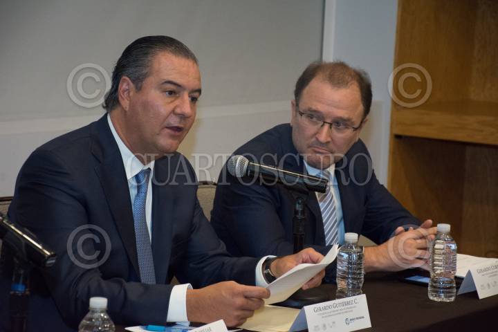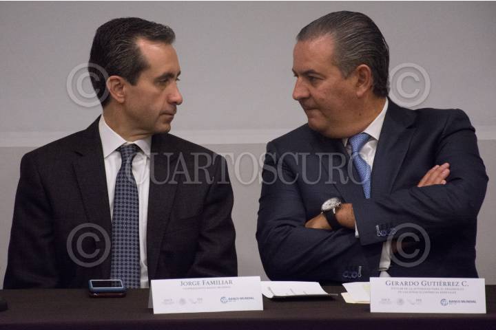 CIUDAD DE MÉXICO, 17MAYO2017.- Gerardo Gutiérrez, titular de la Autoridad para el Desarrollo de las zonas Económicas Especiales (AFDZEE), y Jorge Familiar, vicepresidente del Banco Mundial, durante la Firma de convenio del Banco Mundial con la AFDZEE, el cual establece los puntos de viabilidad en zonas especiales, creación de bases institucionales, mejora en la eficiencia de distribución, marco regulatorio y estrategias de vínculos con proveedores. FOTO: MARIO JASSO /CUARTOSCURO.COM