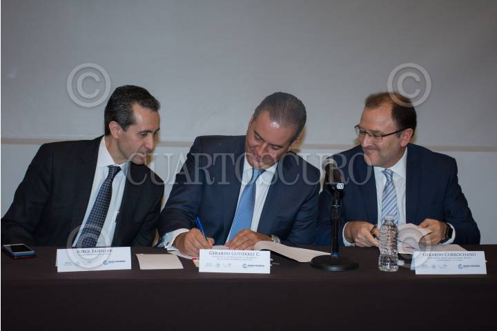 CIUDAD DE MÉXICO, 17MAYO2017.- Gerardo Gutiérrez, titular de la Autoridad para el Desarrollo de las zonas Económicas Especiales (AFDZEE); Jorge Familiar, vicepresidente del Banco Mundial, y Gerardo Corrochano, director del banco para Colombia, México, Latinoamérica y el Caribe, durante la Firma de convenio del Banco Mundial con la AFDZEE, el cual establece los puntos de viabilidad en zonas especiales, creación de bases institucionales, mejora en la eficiencia de distribución, marco regulatorio y estrategias de vínculos con proveedores. FOTO: MARIO JASSO /CUARTOSCURO.COM