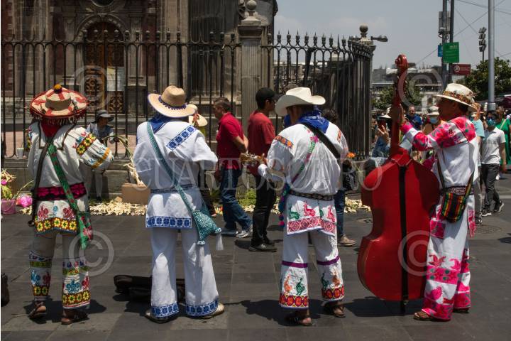Banda musical de huicholes amenizan con "La del moño colorado" el andar de los paseantes en la Catedral Metropolitana.