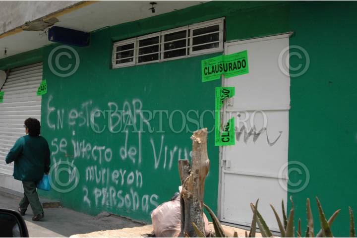 NEZAHUALCÓYOLT, EDO. DE MÉXICO, 13MAYO2009.- Este local fue clausurado por el gobierno local por incurrir en varias iregularidades, aprovechando el virus de la influenza humana, alguna persona pintó consignas para que salgan los bares de la localidad y atribuye la clausura del bar "Cocos" porque se infectaron dos personas que supuestamente murieron. El lugar se encuentra ubucado sobre avenida Chimalhuacán, a unas cuadras del Palacio Municipal. FOTO: MARIO NULO/CUARTOSCURO.COM