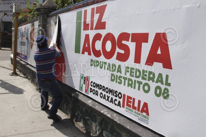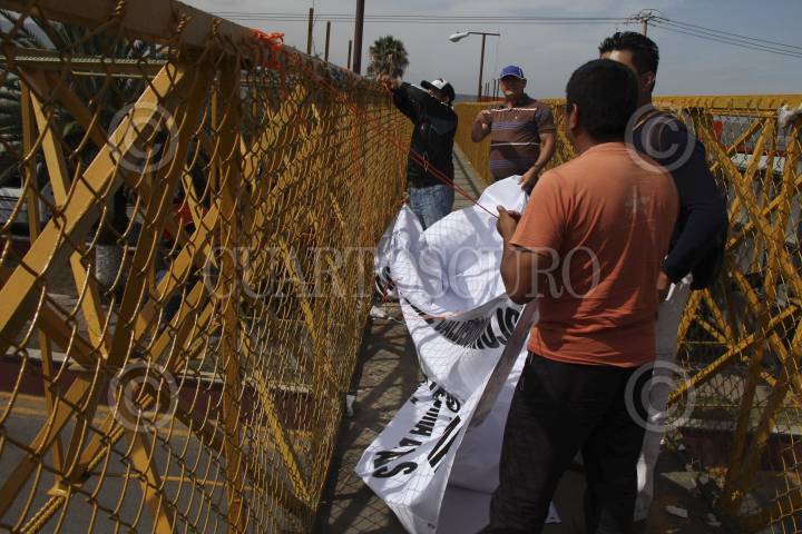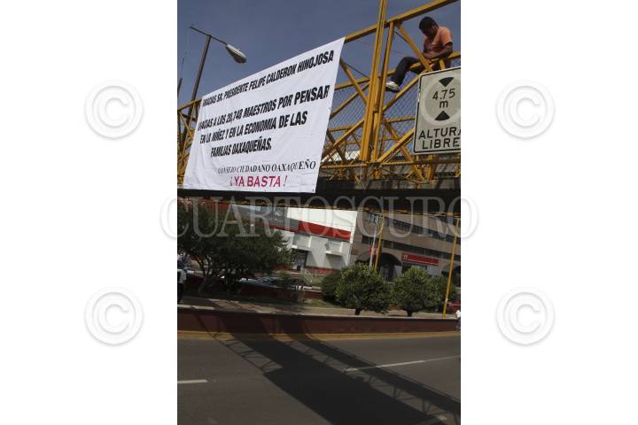 AXACA, OAXACA, 14JUNIO2012.- Maestros del comité de vigilancia de la Sección 22 del SNTE retiran una lona del puente del mercado zonal de Las Flores, la manta fue colocada por integrantes del Movimiento Ciudadano Oaxaqueño ¡Ya Basta!, en la lona felicitaron a los 20 mil 748 profesores que durante la última consulta a las bases votaron por el término del paro indefinido. FOTO: ARTURO PÉREZ ALFONSO /CUARTOSCURO.COM