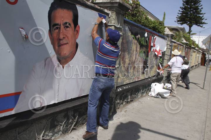 OAXACA, OAXACA, 14JUNIO2012.- Maestros del comité de vigilancia de la Sección 22 del SNTE retiran una lona del puente del mercado zonal de Las Flores, la manta fue colocada por integrantes del Movimiento Ciudadano Oaxaqueño ¡Ya Basta!, en la lona felicitaron a los 20 mil 748 profesores que durante la última consulta a las bases votaron por el término del paro indefinido. FOTO: ARTURO PÉREZ ALFONSO /CUARTOSCURO.COM