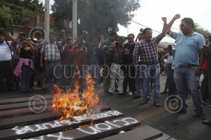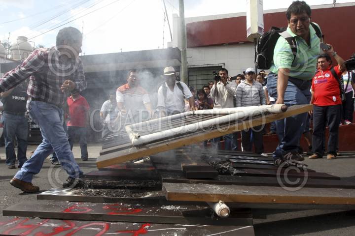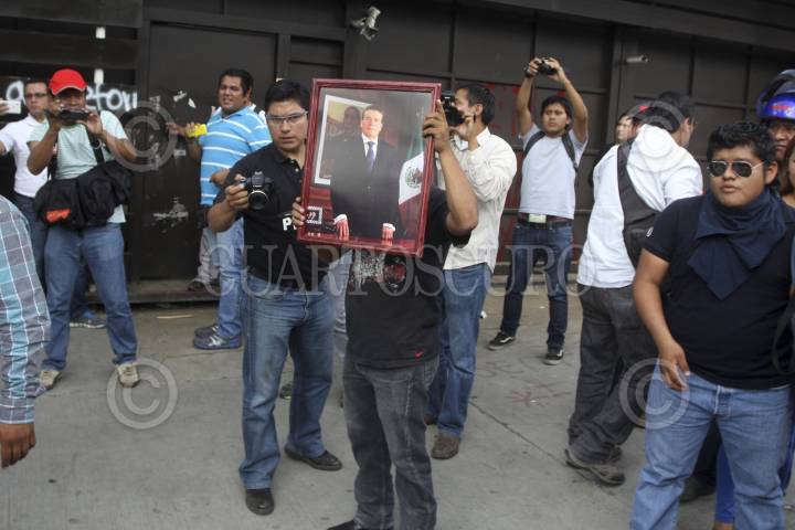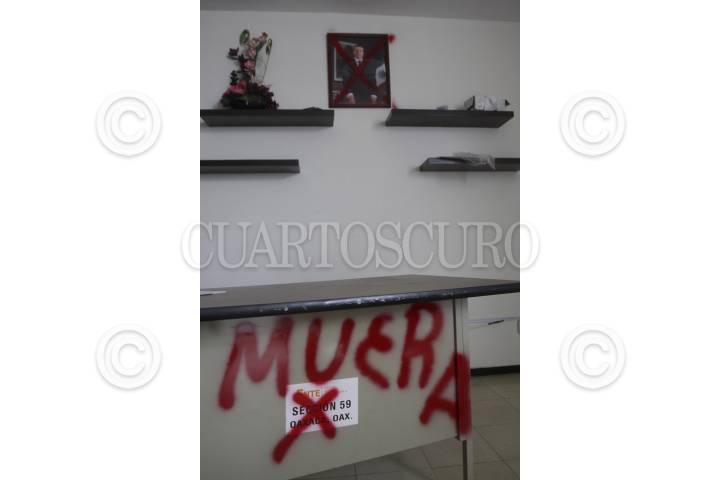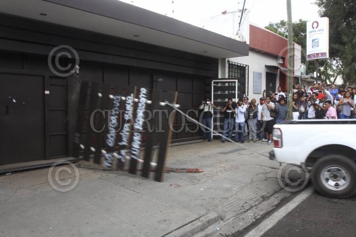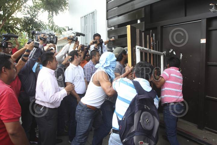 OAXACA, OAXACA, 19AGOSTO2014.- Profesores de la sección 22 de la CNTE bandalizaron las instalaciones de la sección 59 del SNTE, esto en represalia por la retención de 5 profesores en la comunidad de Flor Batavia ubicada en la región de la Cañada, quienes hasta la noche de este miércoles aún continúan privados de su libertad. Los manifestantes quitaron por la fuerza las rejas y abrieron la puerta para después realizar diversos destrozos en el interior de la oficina. FOTO: ARTURO PÉREZ ALFONSO /CUARTOSCURO.COM