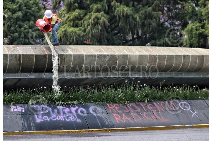 CIUDAD DE MÉXICO, 16MARZO2019.- Un trabajador borra la pintas que realizaron mujeres en la glorieta de la Diana Cazadora el pasado 8 de Marzo, por la manifestación del Día Internacional de la Mujer. FOTO: RODRIGO RUBIO /CUARTOSCURO.COM