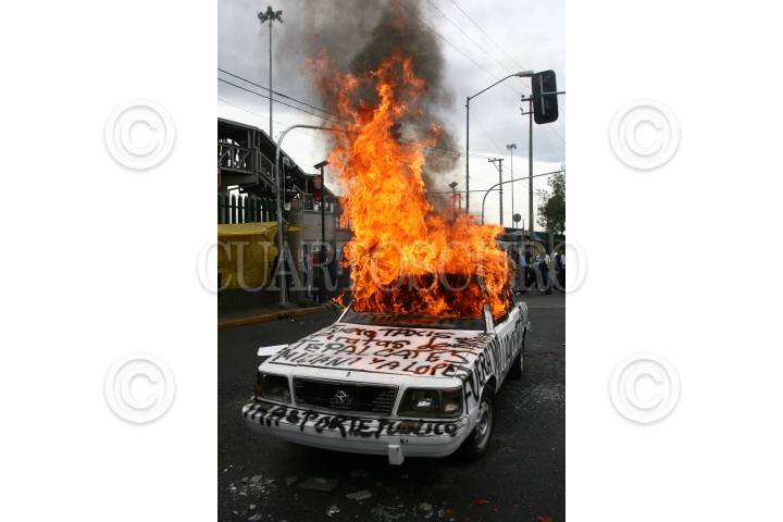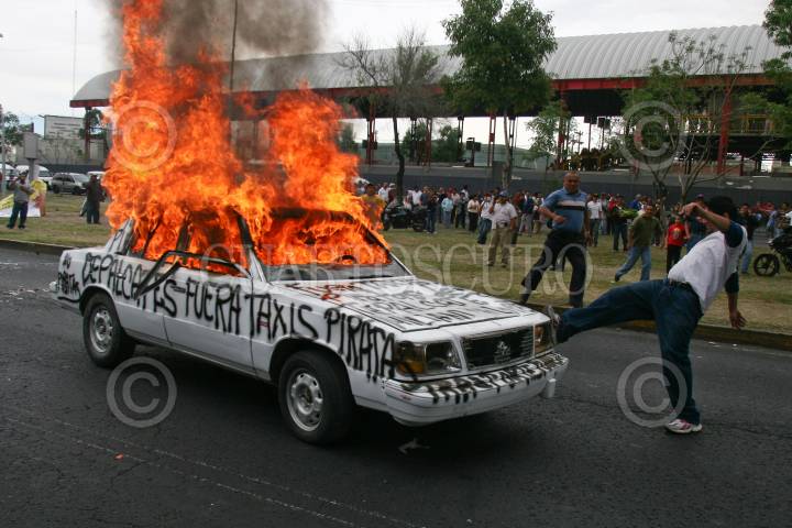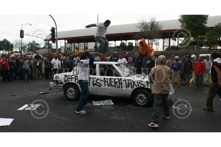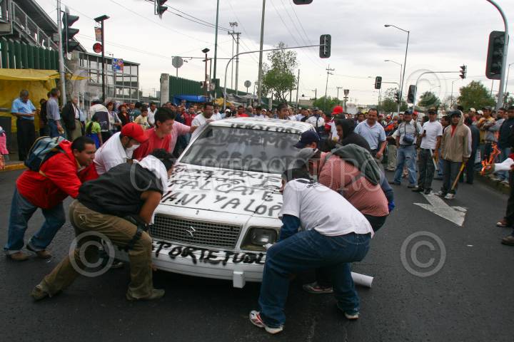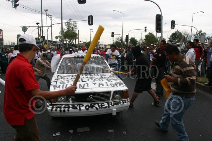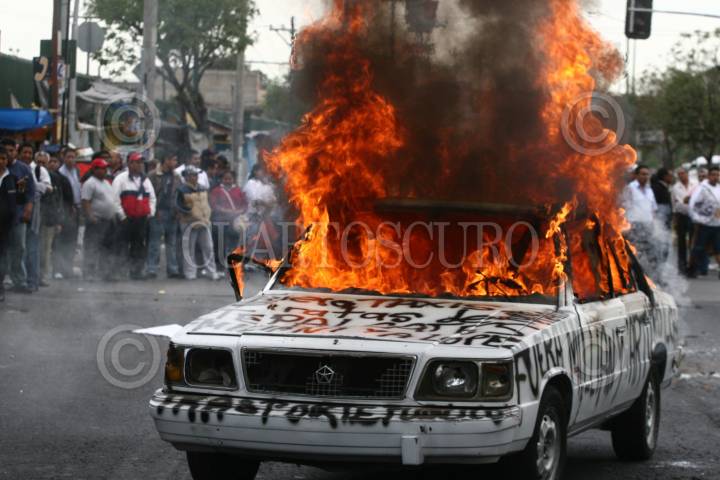 MÉXICO, D.F., 16MARZO2010.- Integrantes de la organización Alianza Mexicana de Organizaciones Sociales (AMOS), quemaron un taxi en los carriles laterales de la calzada Ignacio Zaragoza y se manifestaron bloqueando ambos carriles, los inconformes exigían se retiren los taxis piratas de Tepalcates y Guelatao y exigieron la salida de Bravo Martín Mejía de SETRAVI. FOTO: SAÚL LÓPEZ/CUARTOSCURO.COM