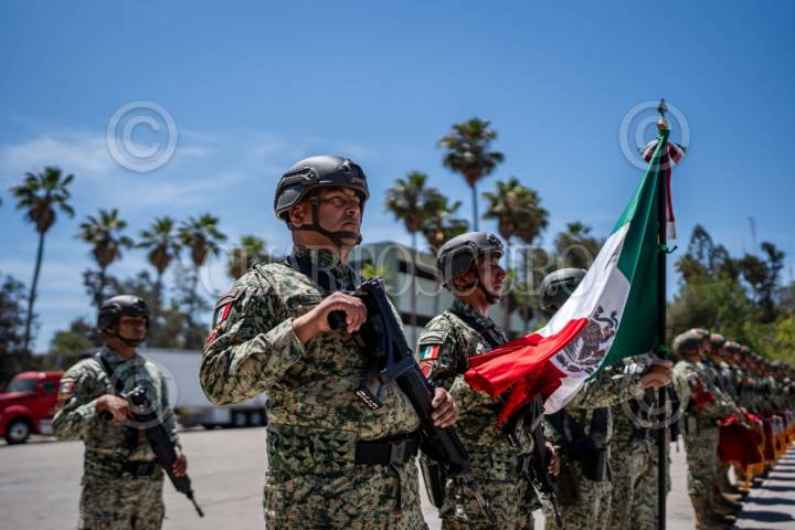 TIJUANA BAJA CALIFORNIA 09JULIO2025.- Militares portando armas y la bandera de México. En el marco del Día Internacional de Destrucción de Armas de Fuego se realizó una ceremonia en la Segunda Zona Militar de Tijuana donde se destruyeron armas aseguradas por autoridades. El comandante Javier Juvencio Hernández destacó el trabajo conjunto de los tres niveles de gobierno para reducir la violencia mediante el aseguramiento y destrucción de armamento. La gobernadora Marina del Pilar informó que Baja California ocupa el cuarto lugar nacional en canje de armas, con 200 armas retiradas de enero a junio. FOTOS CHRIS NOYOLA / CUARTOSCURO.COM