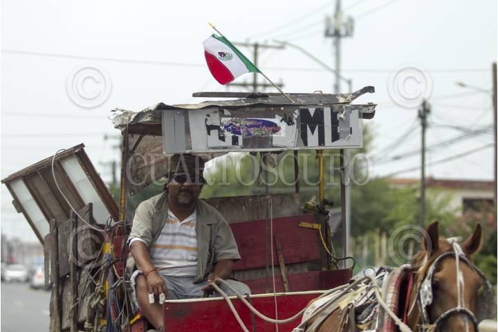 MONTERREY, NUEVO LEÓN, 09SEPTIEMBRE2019.- Un recolector de basura trabaja con su carreta y caballo por calles de la ciudad entre los autos. La carreta porta una bandera de México. FOTO: GABRIELA PÉREZ MONTIEL /CUARTOSCURO.COM