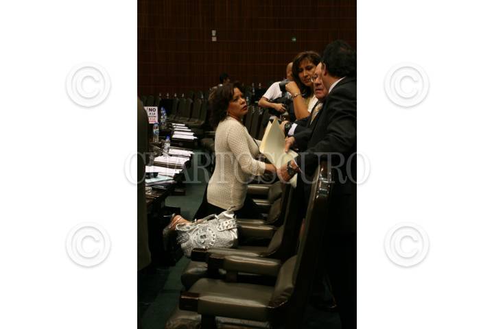 MÉXICO D.F. 08ABRIL2008.-Sesión en la Cámara de Diputados.En la imagen la diputada Patricia Castillo (Convergencia) de rodillas en su curul dialoga con otros diputados. FOTO: GUILLERMO PEREA /CUARTOCURO.COM