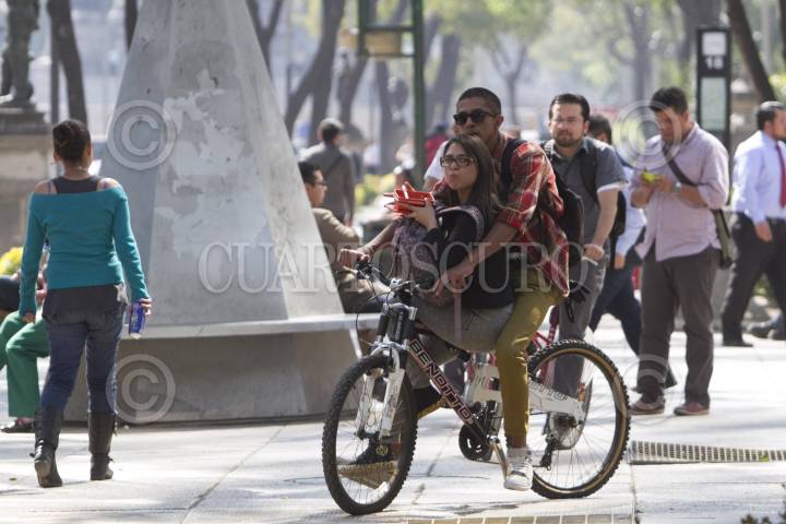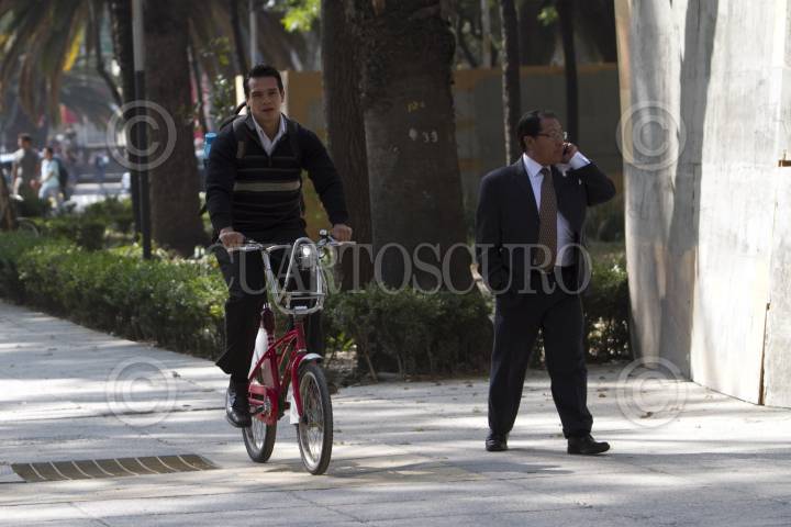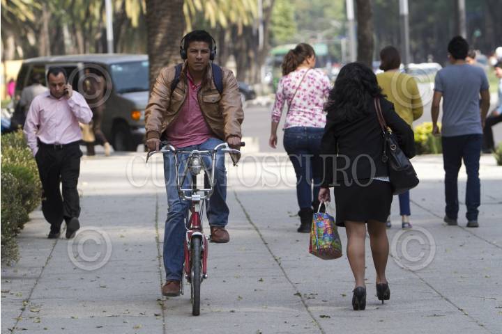 MÉXICO, D.F., 19ENERO2015.- Decenas de personas en bicicleta circulan por la banqueta, esquivando al peatón de avenida Paseo de la Reforma y omitiendo la circulación en el carril confinado para las bicicletas. FOTO: GUILLERMO PEREA /CUARTOSCURO.COM