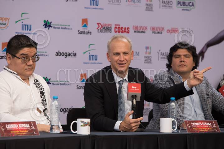 El director de orquesta Carlos Miguel Prieto, el barítono Enrique Ángeles y Jimena Cándano de la Fundación Reintegra durante la conferencia de prensa del espectáculo Carmina Burana, Producción Monumental que se presentó en instalaciones del Auditor