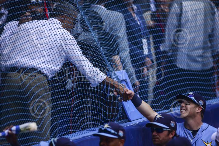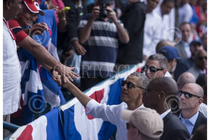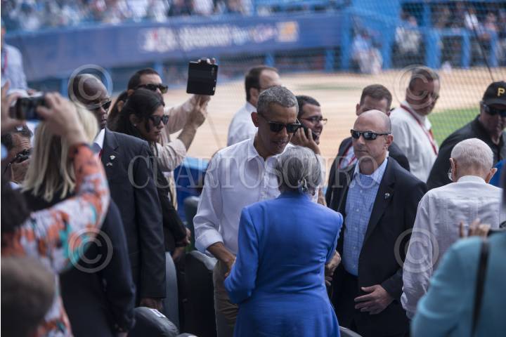 LA HABANA, CUBA, 22MARZO2016.- Barack Obama, presidente de los Estados Unidos saluda a Derek Jeter, judador de los Yankees de Nueva York, durante el partido de béisbol entre los Rays Tampabay y la selección de Cuba, como parte de las actividades para restablecer las relaciones diplomáticas entre la isla y los norteamericanos. FOTO: ADOLFO VLADIMIR /CUARTOSCURO.COM