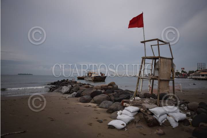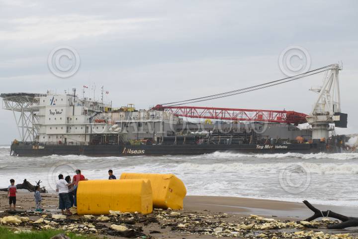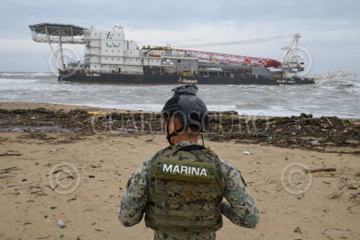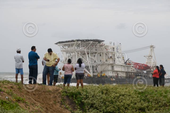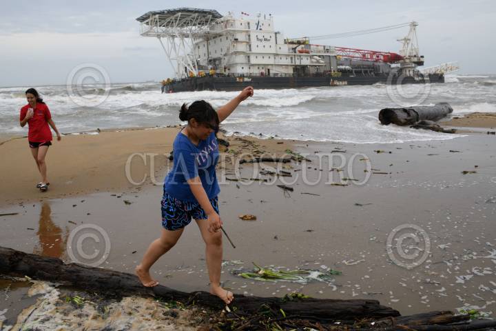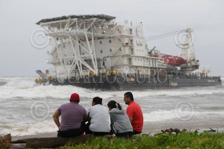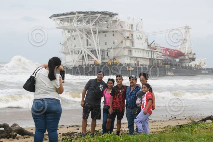 COATZACOALCOS, VERACRUZ, 08SEPTIEMBRE2024.- El frente frío 1 y su interacción con la onda tropical 1 provocaron fuerte oleaje, vientos y lluvia intensa en la zona sur de Veracruz causando que la embarcación Tog Mor encallara cerca de la playa de Villa Allende. Personas curiosas por el hecho se acercaron para ver a la gran embarcación que estaba siendo golpeada por el fuerte oleaje. FOTO: ÁNGEL HERNÁNDEZ/CUARTOSCURO.COM