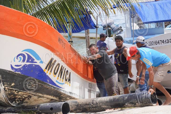Empleados turísticos resguardan sus embarcaciones ante la inminente entrada del huracán Ian en las costas de Quintana Roo.