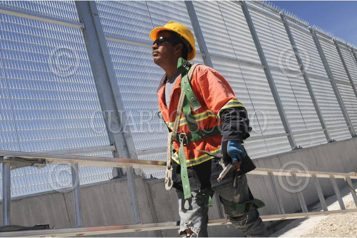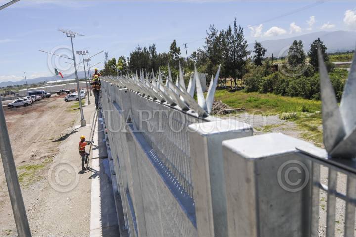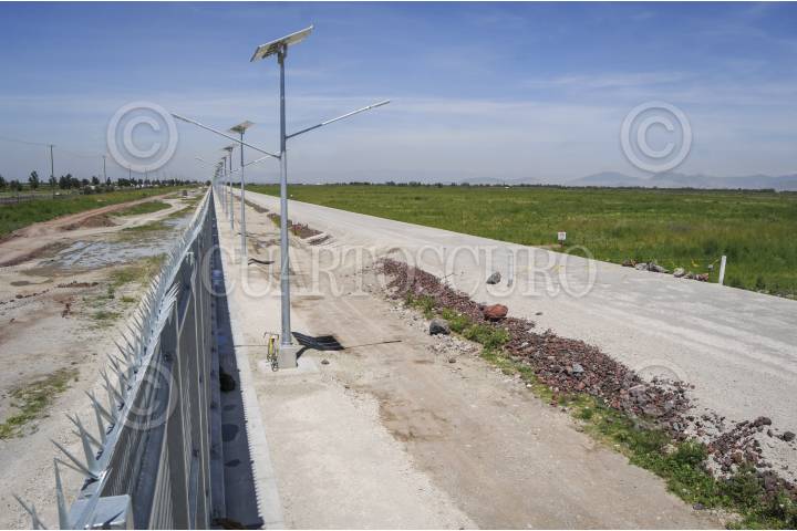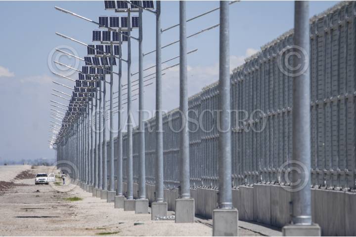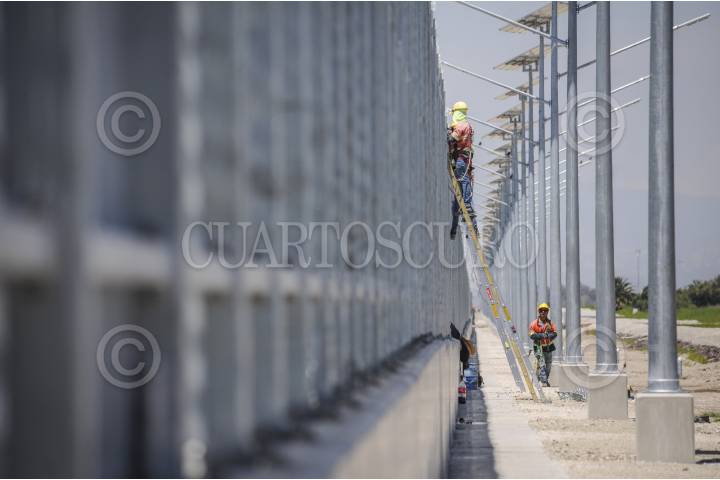 CIUDAD DE MÉXICO, 04AGOSTO2016.- Trabajadores instalan la barda perimetral de lo que será el nuevo aeropuerto internacional de la Ciudad de México (NAICM) en la zona federal del ex-vaso de Texcoco. Además se instalan lámparas con panel solar, baterías de litio y focos led que consumen menos energía. El muro que rodea mide 33 kilómetros y avanza en cuatro frentes (norte, sur, oriente y poniente). FOTO: DIEGO SIMÓN SÁNCHEZ /CUARTOSCURO.COM