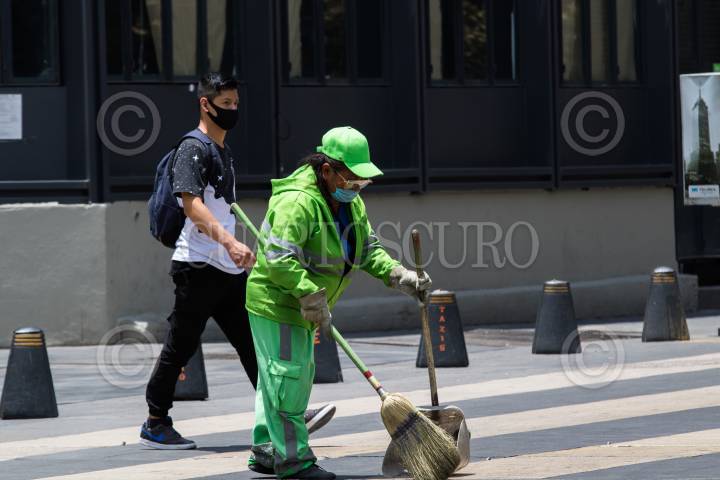 Una trabajadora de limpieza realiza su labor en avenida Juárez.
