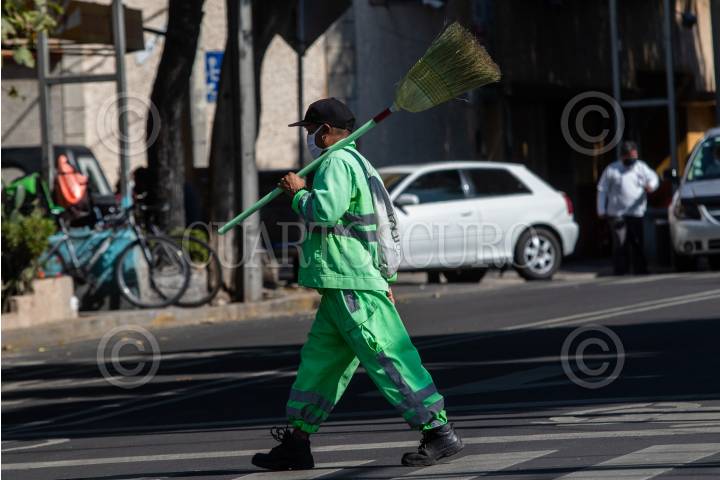 Un trabajador de limpia y su escoba se dispone a barrer calles de la alcaldía Benito Juárez.
