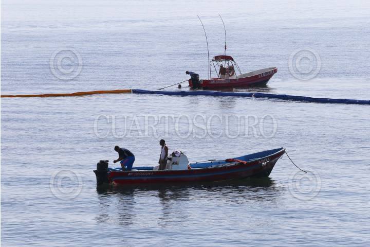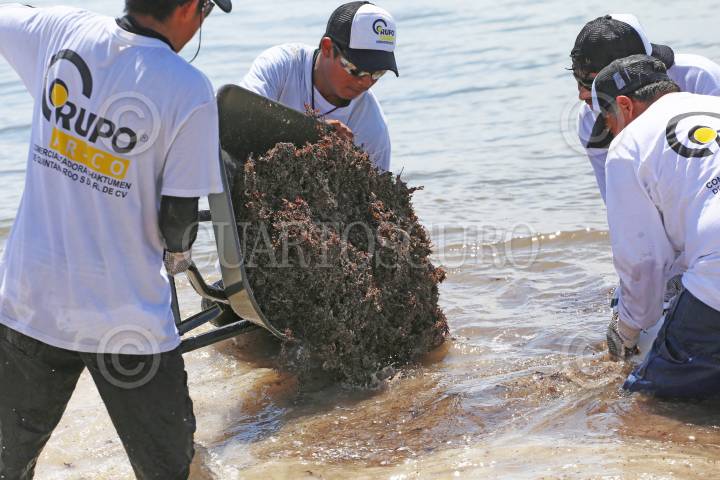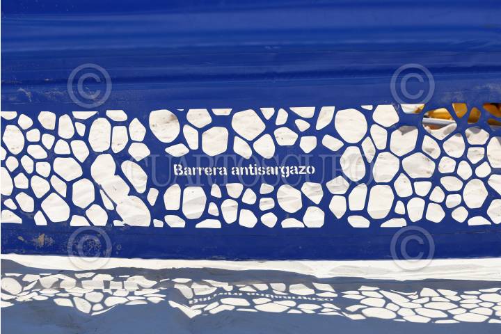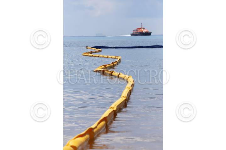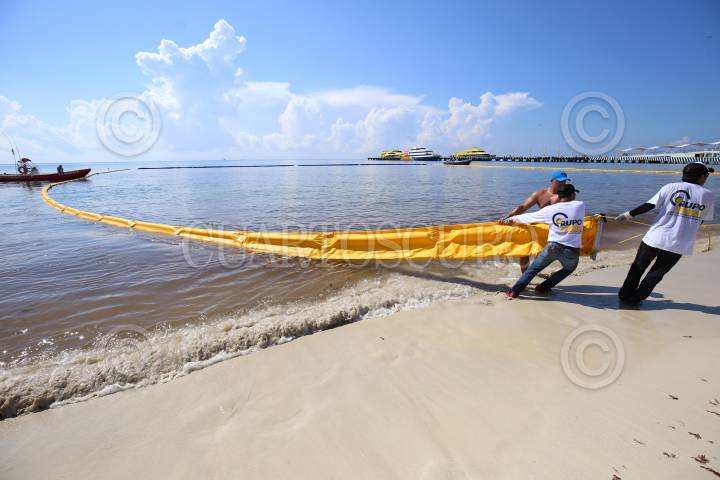 PLAYA DEL CARMEN, QUINTANA ROO, 24AGOSTO2018.- Dieron inicio los trabajos para contener y recolectar la plaga del sargazo con la colocación de un anillo frente a la zona de los arenales de Playa del Carmen que aqueja los litorales de Quintana Roo. La empresa Grupo AR-CO, confirmó que el proyecto comprende varias modalidades para contener, recuperar y confinar el alga, se trata de dos barreras; el primer anillo, más cercano a la costa, está diseñado para detener el sargazo para su posterior barrido mecánico, respecto a la segunda barrera, explicó que está ubicada a 300 metros de la primera, detendrá el sargazo en altamar por lo que será necesaria la utilización de un barco extra para recuperar el alga. FOTO: ELIZABETH RUÍZ /CUARTOSCURO.COM
