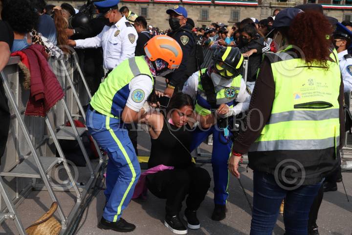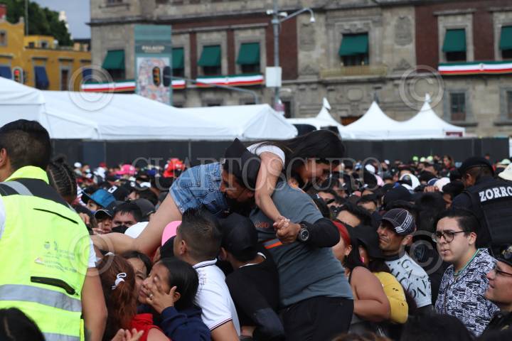 Asistentes al concierto de la agrupación de música Grupo Firme son sacados de entre la multitud por la saturación de espectadores en la plancha del zócalo capitalino.