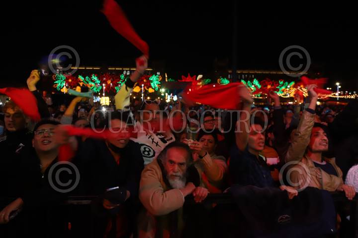CIUDAD DE MÉXICO, 27DICIEMBRE2023.- Un hombre mayor entre jóvenes, se apoya en la barricada de primera fila durante la presentación de la cantante Amandititita en el escenario de la Verbena Navideña 2023 en el zócalo capitalino. FOTO: EDGAR NEGRETE LIRA/CUARTOSCURO.COM