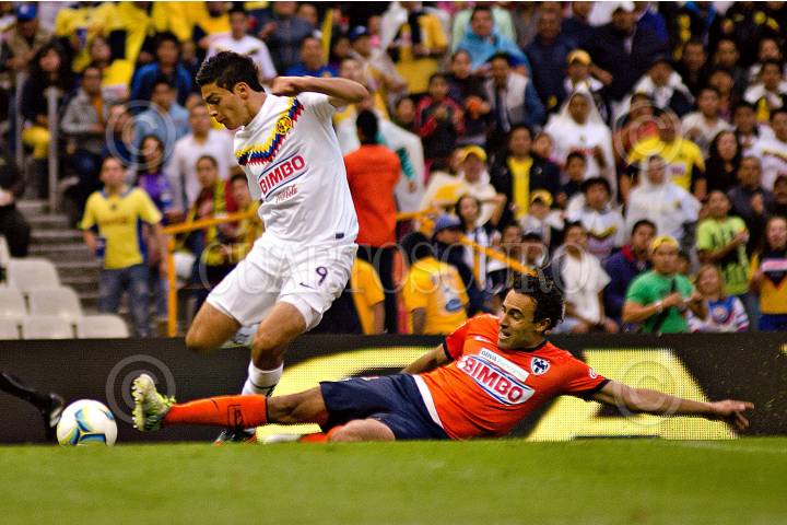 MÉXICO, D.F., 05ENERO2013.- Raúl Jiménez (América) recibe una barrida Leobardo López durante el partido correspondiente a la jornada 1 del Torneo Clausura 2013 de la Liga MX entre las Aguilas del América vs Monterrey y levado acabo en el estadio Azteca. FOTO: MISAEL VALTIERRA / CUARTOSCURO.COM