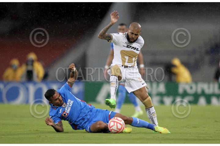 Jesús Escoboza de Cruz Azul se barre para quitar una pelota a Dani Alves de Pumas durante el partido de fútbol Pumas vs Cruz Azul correspondiente a la jornada 15 del Torneo Apertura 2022 de Liga BBVA MX, en el estadio Olímpico Universitario.
