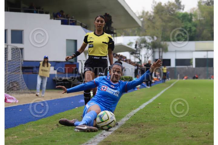 La juez de línea María Fernanda Juárez vigila que no salga el balón, mientras la jugadora Ana Lozada se barre durante el partido de fútbol Cruz Azul vs Monterrey correspondiente a la jornada 6 del Torneo Clausura 2023 de Liga BBVA MX Femenil, en instalaciones de La Noria.
