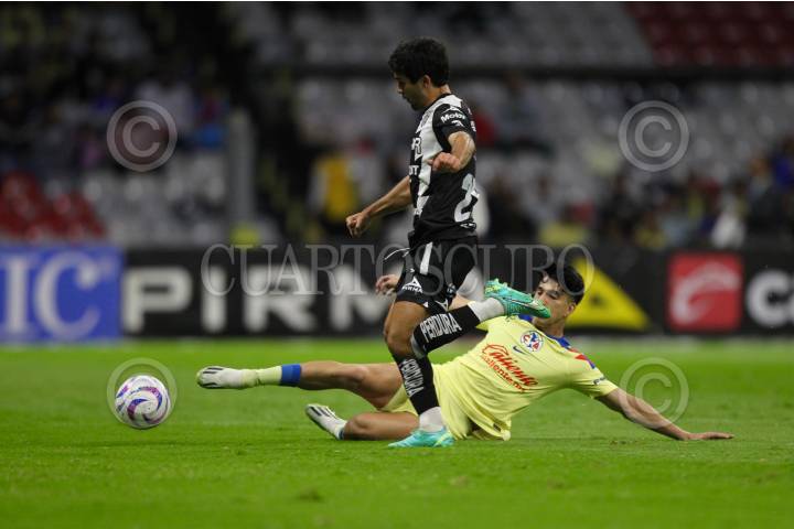 CIUDAD DE MÉXICO, 03FEBRERO2024. Illian Hernández de las Águilas se quita una barrida de Sebastian Vegas de Rayados durante el partido de fútbol América vs Monterrey correspondiente a la jornada 5 del Torneo Clausura 2024 de Liga BBVA MX, en el Estadio Azteca. FOTO: EDGAR NEGRETE LIRA/CUARTOSCURO.COM