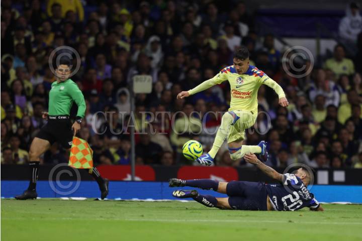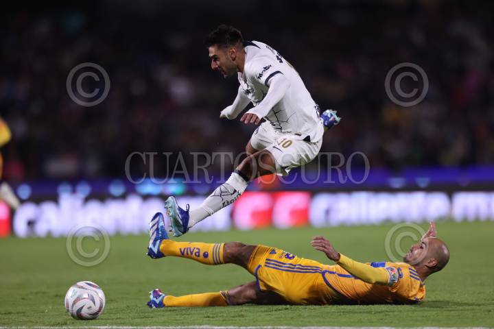 CIUDAD DE MÉXICO, 07DICIEMBRE2023. Eduardo Salvio de Pumas salta tras la barrida de Guido Pizarro de Tigres durante el partido de fútbol Pumas vs Tigres correspondiente a la semifinal de ida del Torneo Apertura 2023 de Liga BBVA MX, en el Estadio Olímpico Universitario. FOTO: EDGAR NEGRETE/CUARTOSCURO.COM