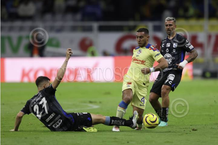 CIUDAD DE MÉXICO, 20ENERO2024. Nicolás Cordero de Gallos Blancos se barre para quitar el balón a Sebastián Cáceres de las Águilas durante el partido de fútbol América vs Querétaro correspondiente a la jornada 2 del Torneo Clausura 2024 de Liga BBVA MX, en el Estadio Azteca. FOTO: EDGAR NEGRETE LIRA/CUARTOSCURO.COM