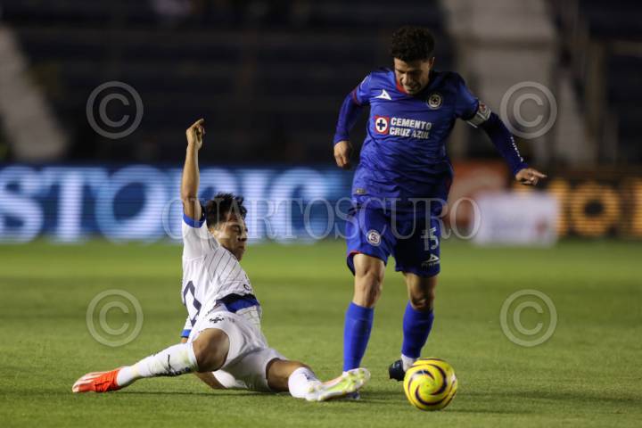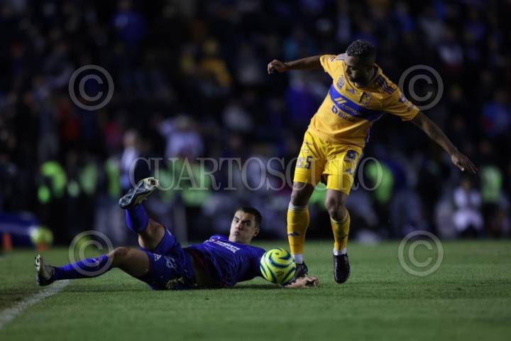 CIUDAD DE MÉXICO, 17FEBRERO2024. Camilo Cándido de Cruz Azul se barre para quitar una pelota a Rafael De Souza de Tigres durante el partido de fútbol Cruz Azul vs Tigres correspondiente a la jornada 7 del Torneo Clausura 2024 de Liga BBVA MX, en el Estadio Ciudad de los Deportes. FOTO: EDGAR NEGRETE LIRA/CUARTOSCURO.COM