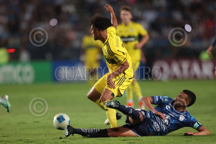 PACHUCA, HIDALGO, 01JUNIO2024. Gustavo Cabral de los Tuzos se barre para quitar una pelota a Jacen Russell-rowe del Columbus durante la final de la Copa de Campeones Concacaf 2024 entre Pachuca vs Columbus Crew en el Estadio Hidalgo. FOTO: EDGAR NEGRETE LIRA/CUARTOSCURO.COM