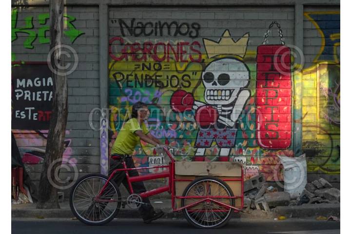 CIUDAD DE MÉXICO, 22ENERO2025.- Un hombre empuja un triciclo por las calles del Barrio Bravo de Tepito, frente a un mural con la frase "Nacimos cabrones, no pendejos". FOTO: ROGELIO MORALES /CUARTOSCURO.COM