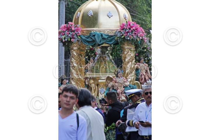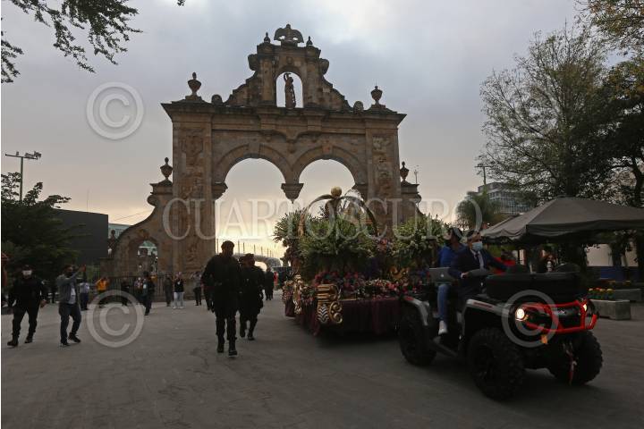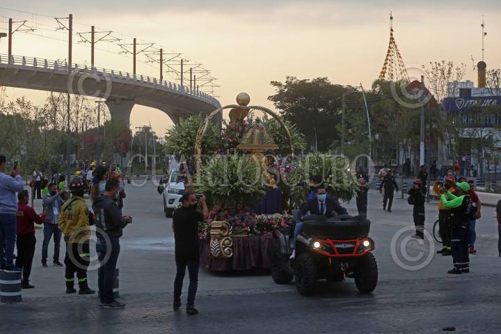 El vehículo que transporta a la Virgen de Zapopan arriba a las inmediaciones del Centro de Zapopan en la Romería 2020.