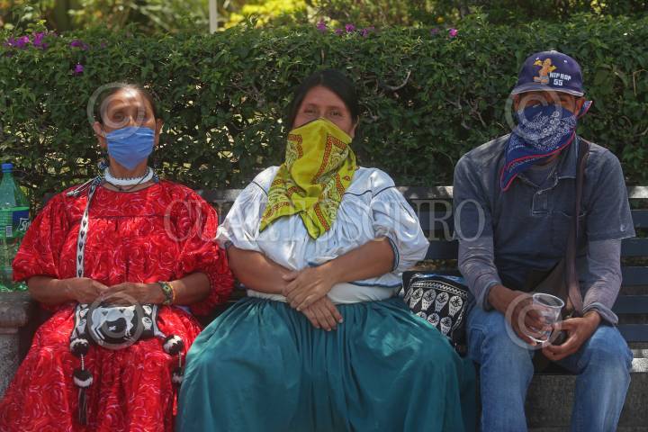 ZAPAOPAN, JALISCO, 31MARZO2020.- Personas de origen Wixárikas esperan sentados mientras comercializan artesanías wirraricas en una banca de la explanada de la Basílica de Zapopan y también toman sus debidas precauciones para contener la pandemia del coronavirus (Covid-19) en el estado. FOTO: FERNANDO CARRANZA GARCIA / CUARTOSCURO.COM