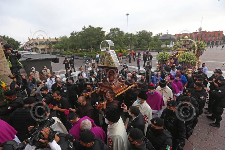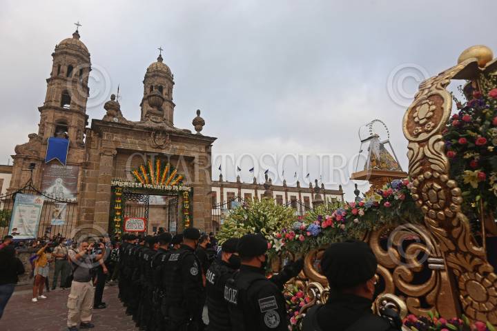 El vehículo que transporta a la Virgen de Zapopan arriba a las inmediaciones de la Basílica de Zapopan en la Romería 2020.