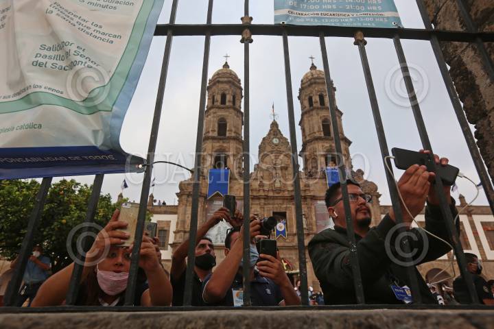 Toma general de la explanada de la Basílica de Zapopan al arribo de la Generala, en esta edición atípica de la Romería 2020 por la Pandemia del Coronavirus.